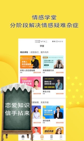 聊天话术回复神器是一款很完整的拥有海量的免费情感知识的干货分享的在线服务的平台,它会很好的的教你如何与心仪的Ta进行聊天,让你从此之后跟任何人的聊天都会变得十分的有趣,让你的形象变得更幽默!