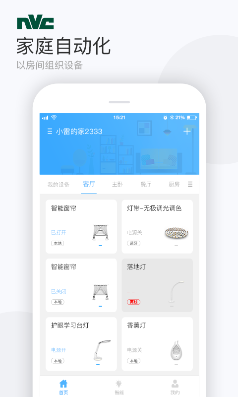 雷士智能家庭app英文名就叫做NVC Home是一款非常稳定好用的智能手机软件哟,为我们在手机上进行稳定便捷的智能操作体验,非常的方便,直接远程就可以控制家里的智能家电啦,还可以切换场景模式,操作简单又便捷,需要就赶紧来下载试试吧