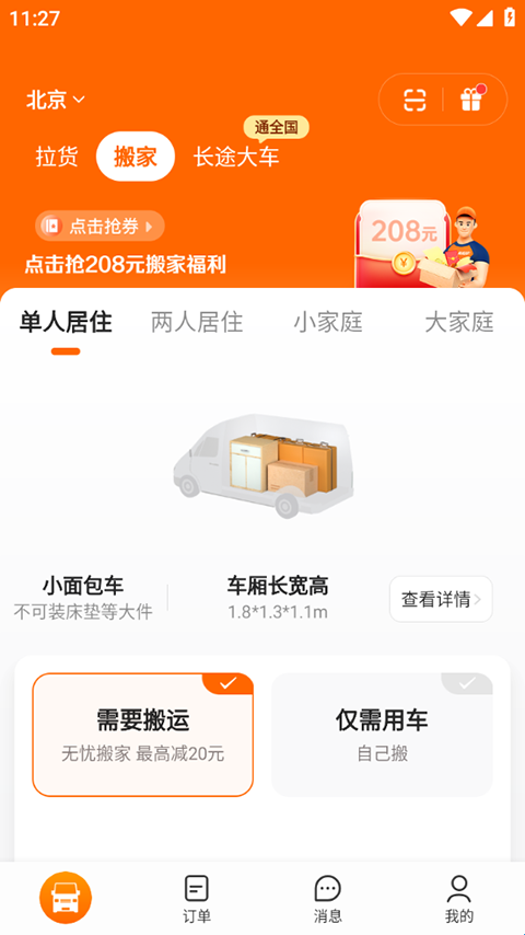2、下订单后,可以选择跟车人数,选择搬运及其他服务,并且还会有优惠卷可以使用,可以在订单页查看正在进行的订单和历史订单,并且可以在消息栏中在线聊天。