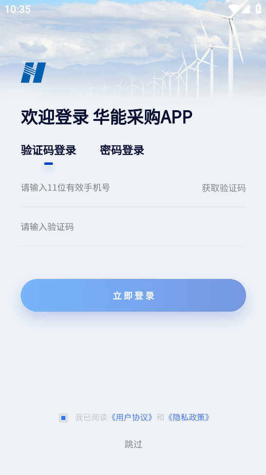 1)华能采购 APP 与 pc 端电商平台统一用户管理模块进行对接,登录方式与 pc 端保持一致,支持手机号+验证码或账号+密码登陆。