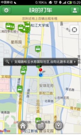 完成注册登录后页面会显示你的位置信息,并默认以此作为你的出发起点,当然也可以语音输入在上方显示附近出租车的信息,如图中所示: