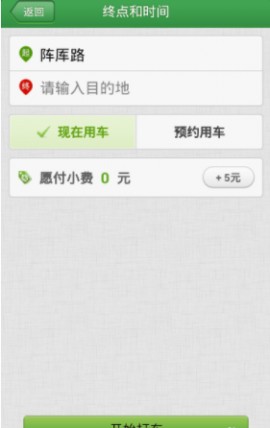 第二步:设置好起始点后,可根据需要现在用车和预约用车,小费情况。界面如下: