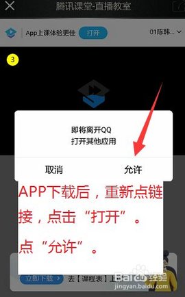 3.app下载安装后,重新点击老师发来的链接,点击“打开”,出示如图的提示,点“允许”。