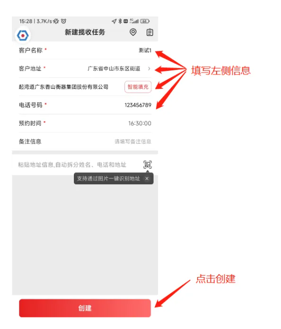 3.在新建揽收界面,完善客户信息,点击创建。