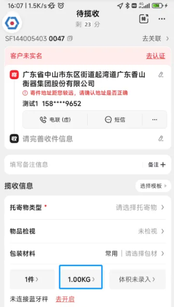 4.揽收任务创建后,界面如下,点击图示“1.00kg”,进入寄托物信息界面,点“去开启”,打开蓝牙,准备连接电子秤。