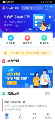 主要支持个人所得税综合所得年度汇算等纳税申报、专项附加扣除信息填报、收入纳税明细查询、异议申诉、涉税证明材料上传、委托代理等涉税业务办理,并配套提供在线咨询、热点问题、帮助中心等功能。
