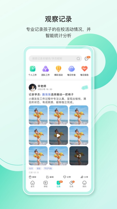 蒙氏手记是一款蒙特梭利教育观察记录工具。可以添加孩子在蒙台梭利幼儿园的日常表现情况,及时将孩子的表现情况反馈给家长。省去繁重的笔记工作,极大的提高老师的工作效率。