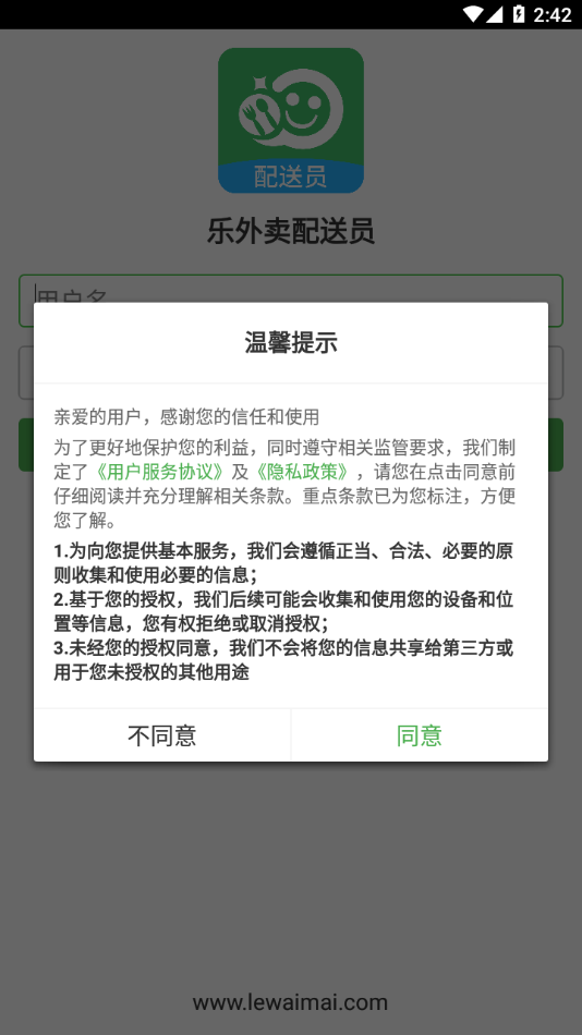 免费下载 大小:81.3M 下载:1次 乐外卖配送员app V2.3.1 官方版 支 持:安卓 分 类:安卓软件 大 小:81.3M 版本号:v2.3.1 官方版 发 布:2025-03-01 01:09:26 手机扫码免费下载 #乐外卖配送员app V2.3.1 官方版简介 乐外卖配送员app是专为广大配送员制作,软件拥有新订单提示,实时来单提醒,路线导航等等丰富功能,可以帮助更好的外卖配送。乐外卖配送员app介绍:乐外卖配送员,专门为外卖配送员打造的一款APP。乐外卖配送员app功能:新订单来了自动语音提示,第一时间了解订单动态实时来单提醒,实时处理来自乐外卖系统的订单提供路线导航,方便配送实时上传配送员位置,帮助顾客了解配送动态,提高顾客体验乐外卖配送员怎么注册:乐外卖配送员无法自助注册,账号密码都后台录入发放。更新日志bug修复,提高系统性能和版本兼容。 #乐外卖配送员app V2.3.1 官方版截图