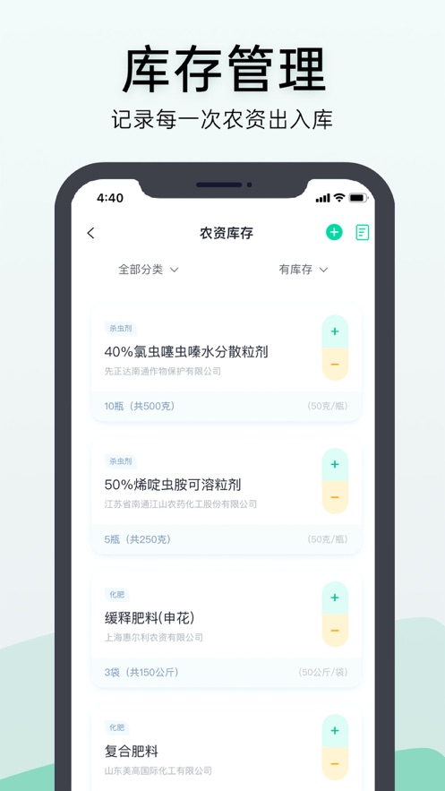 ◆ 可管理肥料、农药、种苗的库存,支持各类出入库操作