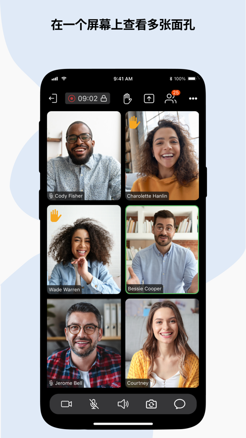 - 视频会议可以使用您的前置或后置摄像头。通过面对面的交流协作迅速达成共识,解决分歧。