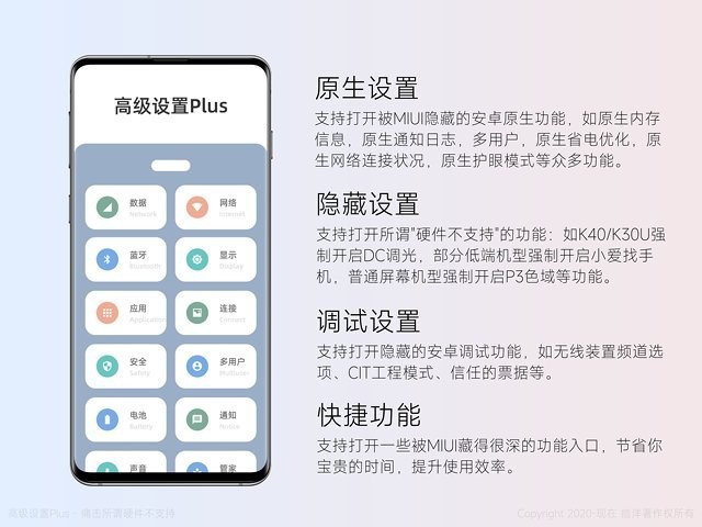 支持打开被MIUI隐藏的安卓原生功能,如原生内存信息,原生通知日志,多用户,原生省电优化,原生网络连接状况,原生护眼模式等众多功能。