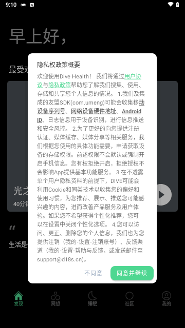 Dive HealthApp是一款由思潜科技(北京)有限公司打造的一款手机助眠服务软件,这款软件中有有着很多的助眠功能给用户们提供,多类型的服务都是免费的,用户们在这里就放心的进行睡眠服务,没有任何的门槛让用户们能够拥有一个良好的睡眠。
