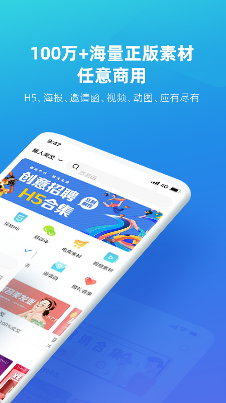适用于教育培训、招生迎新、企业招聘、个人名片、个人简历、音乐相册、H5、办公文档、GIF动图、美照拼图、邀请函、节日促销、宣传营销、广告推广、贺卡请柬、电商详情页、视频等,满足生活、商业、娱乐等各场景。