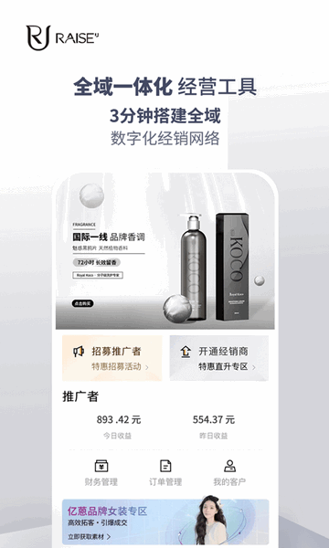 Raise U——全域一体化经营工具。Raise U,是数字化经销系统经营管理软件。赋能客户快速搭建全域数字化经销网络,实现从公域到私域,从线下到线上,从销售到推广的全域流量沉淀,帮助每一位客户全方位创造增量价值,助力品牌数字化升级。一体化经营解决方案,让你的生意翻倍增长专业的事情统统交给我们,你只需专注业务本身。