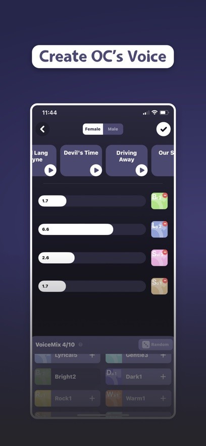 3、点击试听卡片,可在调制声线时试听该声线唱歌