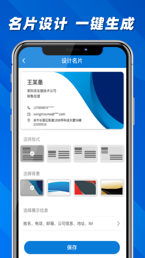 名片制作:提供众多名片模板和名片背景样式,可根据自己的喜好进行自由搭配,不同的电子名片模板搭配不同的电子名片背景,还支持将自己手机本地相册中的精美图片作为名片背景使用,电子名片制作过程简单方便。