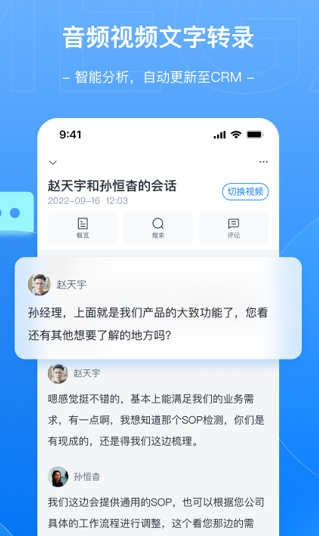 聊天记录、销售会话、会议视频自动同步汇总,客户跟进情况一目了然。