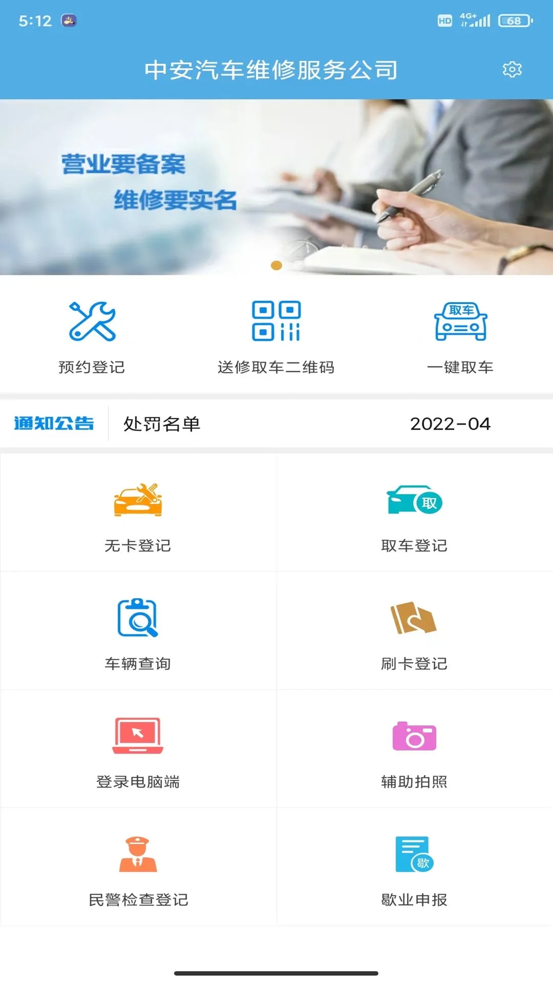 中安车服企业app是一款车辆维修登记移动服务平台,平台拥有车辆信息登记,车辆业务登记,公告等等丰富功能,需要的朋友欢迎前来下载使用。