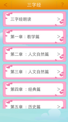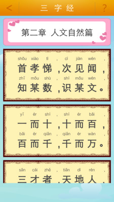 三字经app免费下载三字经是一款由无锡陈马软件有限公司推出的非常适合孩子朗读的亲子国学教育的app软件哦~三字经app是以古典的颜色为主题的简介大气的界面哦~有丰富的学习课程,三字经等等哦~