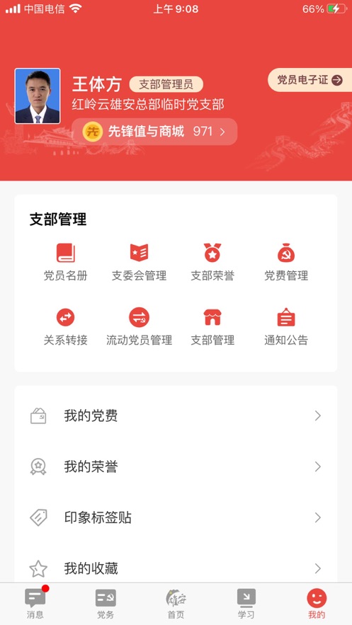 组织关系转接、党费收缴、志愿服务、先锋值兑换、党建书架、困难帮扶、网上找组织等党员服务功能;