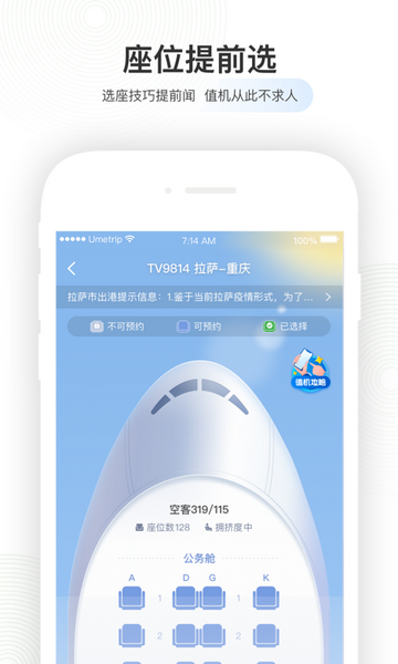 在这个界面我们输入我们购票凭证号码,手机号码,航班号码,就能进入详细的值机画面了。在这里我们可以直接点击更换座位,以及进行托运的布置