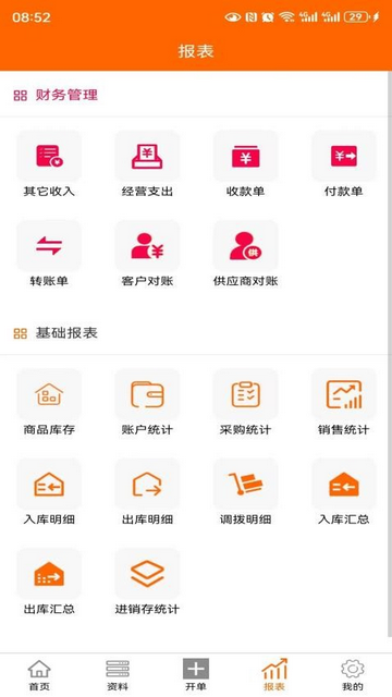 5、查看统计报表,了解商品库存和收支情况。