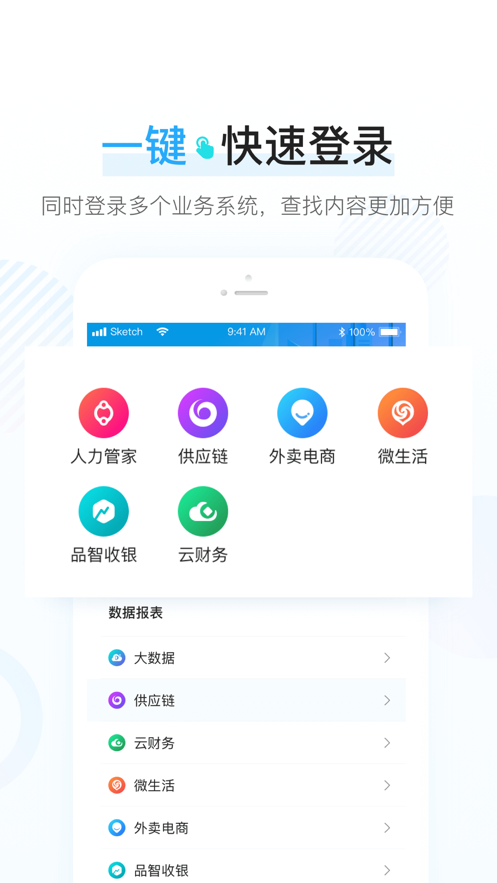 1.使用单点登录方式,集成奥琦玮所有的餐饮系统(包括:收银、供应链、微生活、外卖、人力管家、云财务等),同时亦开放性地支持其他业务系统的接入――您不用再同时登录多个餐饮业务系统,一个App就够了;