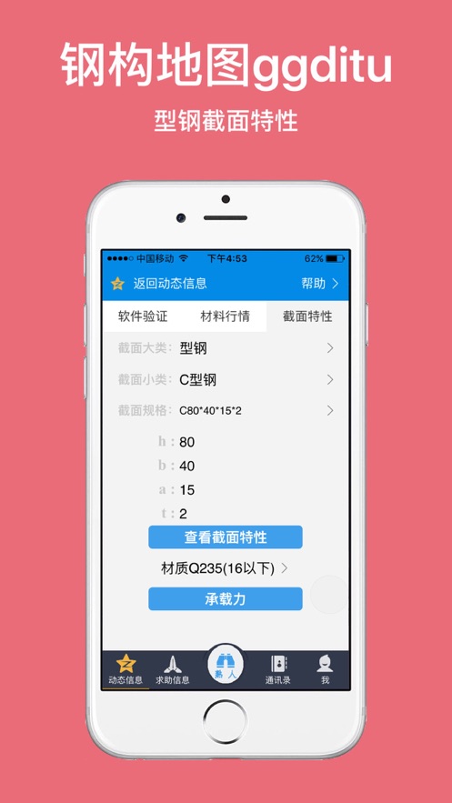 可以利用它生成钢构地图网站中钢结构软件的验证码,有些简单的常用的软件功能,比如截面特性及基本承载力也可以在APP实现,当然,钢结构行业相关的资讯及技术资料会在“动态信息”频道中推送,还有钢结构相关的主材价格行情可以根据日期查询。