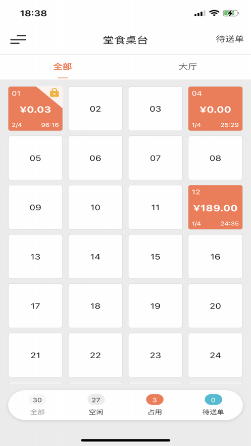 1、门店所有桌台展示,开台以及桌台状态