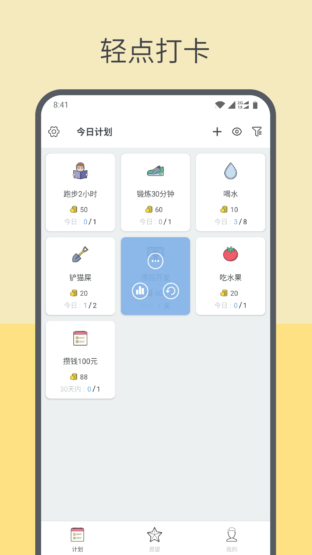 3、随时都可以设置计划来进行自我管理,完成了计划之后还可以获得金币奖励,激励自己更好的执行;