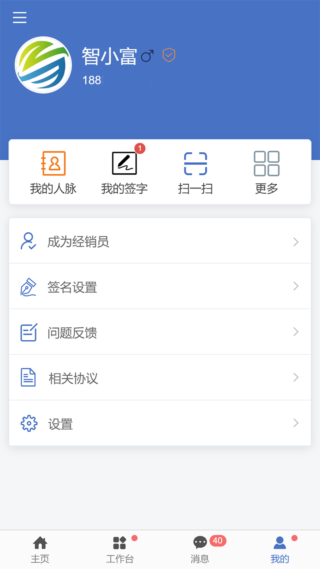智富宝app下载是广州智富互联网科技有限公司官方倾情推出,软件拥有首页,工作台,消息,我的等等功能板块,可以帮助更好的企业经营管理。