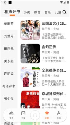 聆韵听书这款软件的资源非常丰富,涵盖了许多知名作品。首页展示了众多大神的创作,包括评书、男频、女频以及睡前必听的推荐,还有一个必备的更新榜单,方便用户追更。分类页面则提供了相声评书、小说、音乐、儿童故事、财经内容、广播剧、脱口秀等多种类型,用户可以轻松找到自己想听的内容,且资源更新速度也相当迅速。