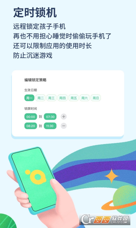 【定时锁机】:您可以选择临时锁定孩子手机,也可以选择固定的时间点来锁定孩子手机,在学习和睡觉的时间,锁定手机,让孩子养成良好的生活作息习惯。
