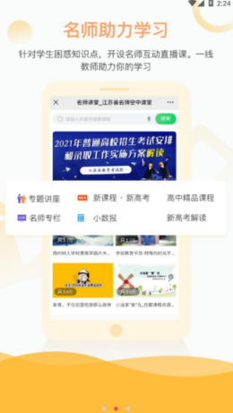 1,江苏省名师空中课堂app通过庞大的数据渠道模式来进行各种丰富的课程视频资源来进行导入,包含了小初高各种科目中丰富的知识点内容,让用户可以轻松的来进行在线学习。
