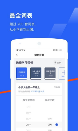3,最全词表,自由使用,软件中建立了庞大的单词词库内容,用户可以自由的来进行选择各种词汇数据来进行复习和巩固,更好的面对各种考试。