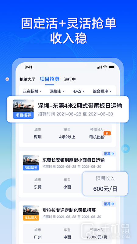 1、项目加入:在线加入各种项目中,每日都能让你获取固定的运输订单