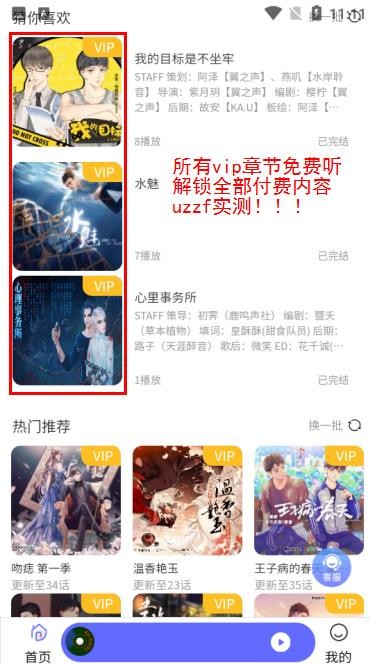府声fm免费vip会员全解锁是一款涵盖了超多免费好听广播剧资源的手机软件,这款软件中的所有付费内容以及会员全被破解,实时更新不同风格类型的音频资源,可以在这里一键轻松畅听各种广播剧内容。发现超多的精彩,很多热门的广播剧资源都是可以看到,喜欢的小伙伴都是可以来这里尝试的哦。