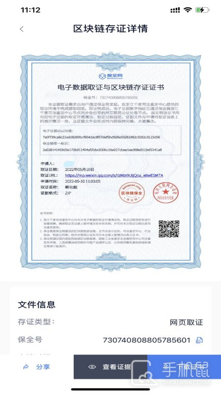 3、在掌上取证成功对您的电子数据文件进行区块链存证之后,您将会取得由保全网与杭州互联网公证处共同签发的电子数据区块链存证证书,用于证明对应电子数据自存证成功起已经存在,并且内容保持完整,未被篡改