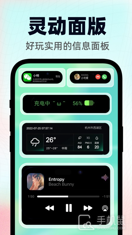 灵动小组件app专为安卓手机打造的实用工具类应用,集成了各种丰富多彩的桌面小部件和功能组件,用户可以自由选择并定制各种样式、大小的小组件,方便快捷地查看天气情况、日程安排、时间日期等信息,同时还能快速启动常用应用程序或设置功能。它不仅保留了传统通知栏的基本实用功能,如即时消息通知与充电状态显示,更在此基础上融入了创意无限的灵动元素,让您的手机界面焕然一新,体验媲美苹果手机灵动岛的直观与个性化。