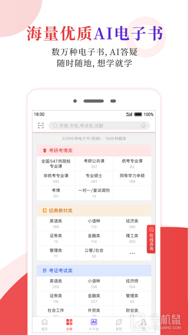 圣才电子书是一款方便用户随时随地阅读的优质安卓应用,该应用汇集了丰富的图书资源,涵盖了各个领域的经典和最新热门作品,包括小说、人文社科、历史传记、教育教育等,用户可以根据个人喜好,通过简洁直观的界面快速找到心仪的图书,并使用自定义阅读模式进行阅读,提供了白天和夜间模式可调节照明亮度,背景字体颜色等,带来更为舒适的阅读体验,用户还可以收藏喜欢的图书、标记重要片段,并利用智能书签功能记录已读进度,更值得一提的是,圣才电子书还支持离线下载,让用户在无网络环境下也能畅享阅读乐趣。