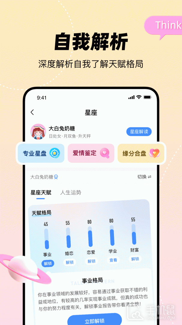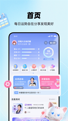 星盘分析,全面解读,了解真实自我; 缘分合盘揭秘亲密关系,鉴定缘分深浅; 生成专属爱情报告,揭秘脱单时间,你的恋情解读专家。