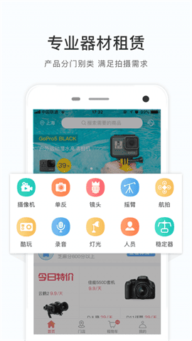 5、丰富的器材商品分类专区,其中有稳定器、灯光、航拍以及人员等多种资源类型。