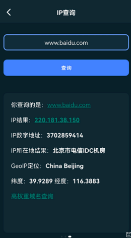 2,IP查询,处理接单,用户可以点击各种不同类型的数据模式可以更加轻松的来进行管理各种网络速度,处理起来更加简单方便,输入就可以快速查询。