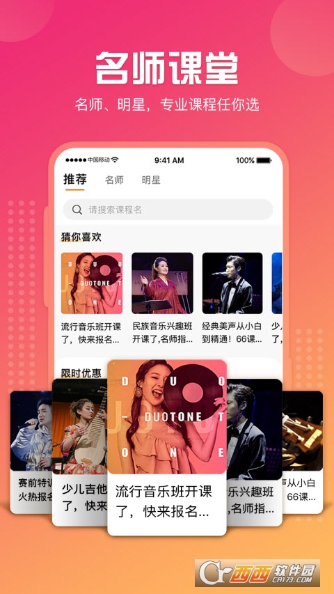 平台以“名师&明星课堂”为课程教学的亮点,提供在线课程,用户可以根据自己喜好选择相关课程进行系统学习,同时平台邀请各类音乐名师、明星发布教学课程,让学员在音乐的道路上加速成长。