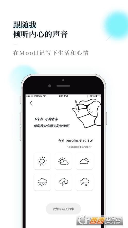 我们生活在一个信息过载的时代,太多的碎片和噪音让我们很少去倾听自己的心声。跟随我,倾听内心的声音,在Moo Diary记录心情,感受,生活,记忆和美梦吧。