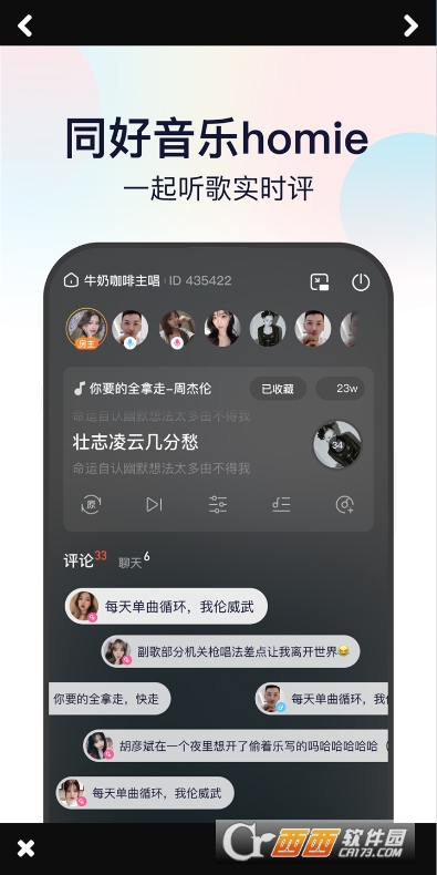 3、音乐交友,时刻发现相近喜好的音乐homie ,一起听歌实时互动,共同享受音乐的震撼。