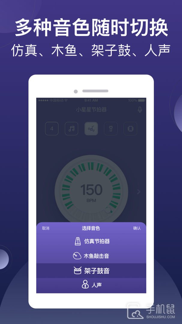 提供多种音色供选择,如仿真节拍器、木鱼敲击音、架子鼓音和人声等,可选择不同音色来满足不同情况的需要