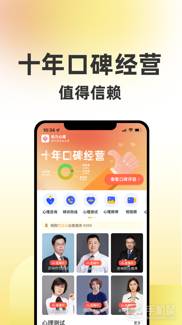 2、专业的心理咨询平台,通过用户自主选择、自主评价,平台全面真实展现咨询师的的数据及能力。可电话直拨咨询、视频咨询、语音咨询、图文咨询等多种咨询方式