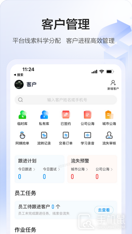 58智慧家政1.0版本,通过平台线索分配、客户管理及阿姨共享库辅助商家跟进客户,撮合交易,助力家政经营。