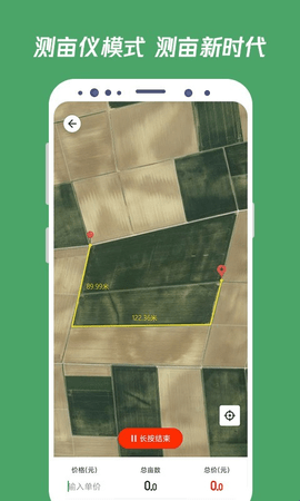 主要两个工能,画地模式和绕地模式,画地模式可以手动打点地图形成圈来测亩并且可以自动计算价格。绕地模式为人工开启后,围绕需要测量的土地行走,GPS会自动定位,最后可自动测量土地面积。